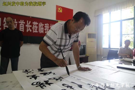 8月13日上午9时,全国红军小学建设工程理事会理事长、中国人民解放军海军原副司令员赵兴发中将、中国人民解放军济南军区原副司令员,空军司令员郭玉祥中将、中国人民解放军空军原副政委黄新中将、中国人民解放军海军航空兵原副参谋长沈克恒少将、中国人民解放军空军工程大学原副校长黄万荣少将一行,在宜昌市政府副市长王应华、宜昌市教育局局长苏开美、我校校长陈锋等同志陪同下来学校调研视察。赵兴发中将一行兴致勃勃地参观了校园的教育训练和生活设施。在欢迎仪式上,赵兴发将军和王应华副市长分别发表了重要讲话,勉励同学们要好好学习,刻苦磨练,将来做祖国的有用之才,为中华民族的伟大复兴、实现“中国梦”贡献力量。在二楼党员活动室,将军们听取了陈锋校长关于学校建设发展情况的汇报,并和学生代表进行了亲切座谈,赵将军一行对我校办学以来所取得的成果给予了高度评价。之后,各位将军兴致盎然为学校亲笔题字,留下了宝贵的笔墨。最后,赵兴发将军一行和全校师生合影留念。将军们在宜期间,参加接待的我市领导有:宜昌市委副书记王兴於、宜昌市政协主席李亚隆、宜昌市市委常委宜昌市军分区政委李智、宜昌市军分区司令员孟春林等同志。