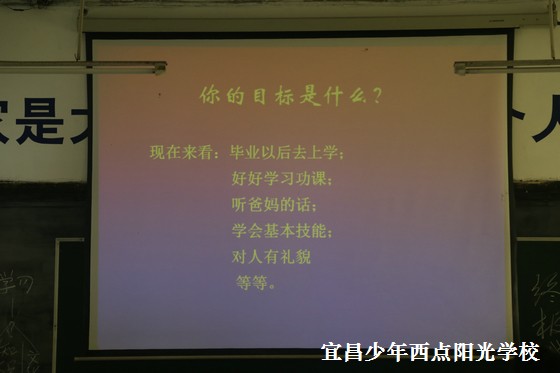 戚教授讲课一开始,就说在新的一年里要做的事情很多,如要改变过去不良行为习惯和不良表现,等等。但戚教授说要做的事情再多,简单概括起来就两个字“学习”,学做人,学科学文化知识。因此,戚教授在课里讲解了新年新目标,要求同学们在新一年里自己给自己规定一个新目标。许多同学们很有感触和深受启发,纷纷表达了新一年的新目标。只要我们有了生活和奋斗的新目标,便会有前进的动力。我们做人就是要这样,不断树立目标,然后努力实现目标,这样,我们的人生才会过得充实,才不会整天无所事事,虚度光阴。父母把大家送到宜昌少年西点,想让这里的生活改变自己,其实,想要真正的改变自我,还是要靠大家自己去想,去做,这样,才能从骨子里去改变,成为一个崭新的自己。戚教授告诉同学们。“现在唯一能做的便是在西点过好每一天的生活,好好训练,用一个好的心态去面对一切困难、挫折,从中吸取教训,得到成长,以致心灵上得到净化,从根本上得到改变。”但对于现在的同学们来说,目标就是完成教员布置的所有任务,在每次的体能训练中坚持下来,然后不断提升自我,改正自身不足,尽早回家恢复学业。