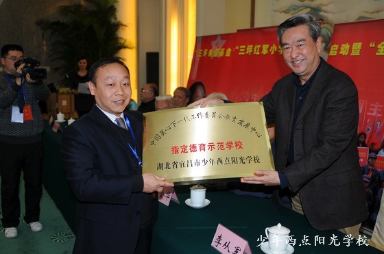 经过国家关工委一年来的调研考评,我校被指定为“全国德育示范学校”,在颁奖仪式上,中央委员、新华社社长李从军同志为我校授铜牌。