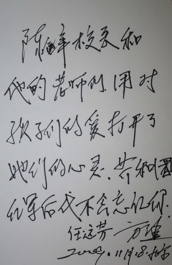 全国红军小学建设工程理事会主任、方强;老一辈革命家任弼时同志的女儿任远芳为我校题词:陈锋校长和他的老师们,用对孩子们的爱打开了她们的心灵,共和国红军后代不会忘记你。